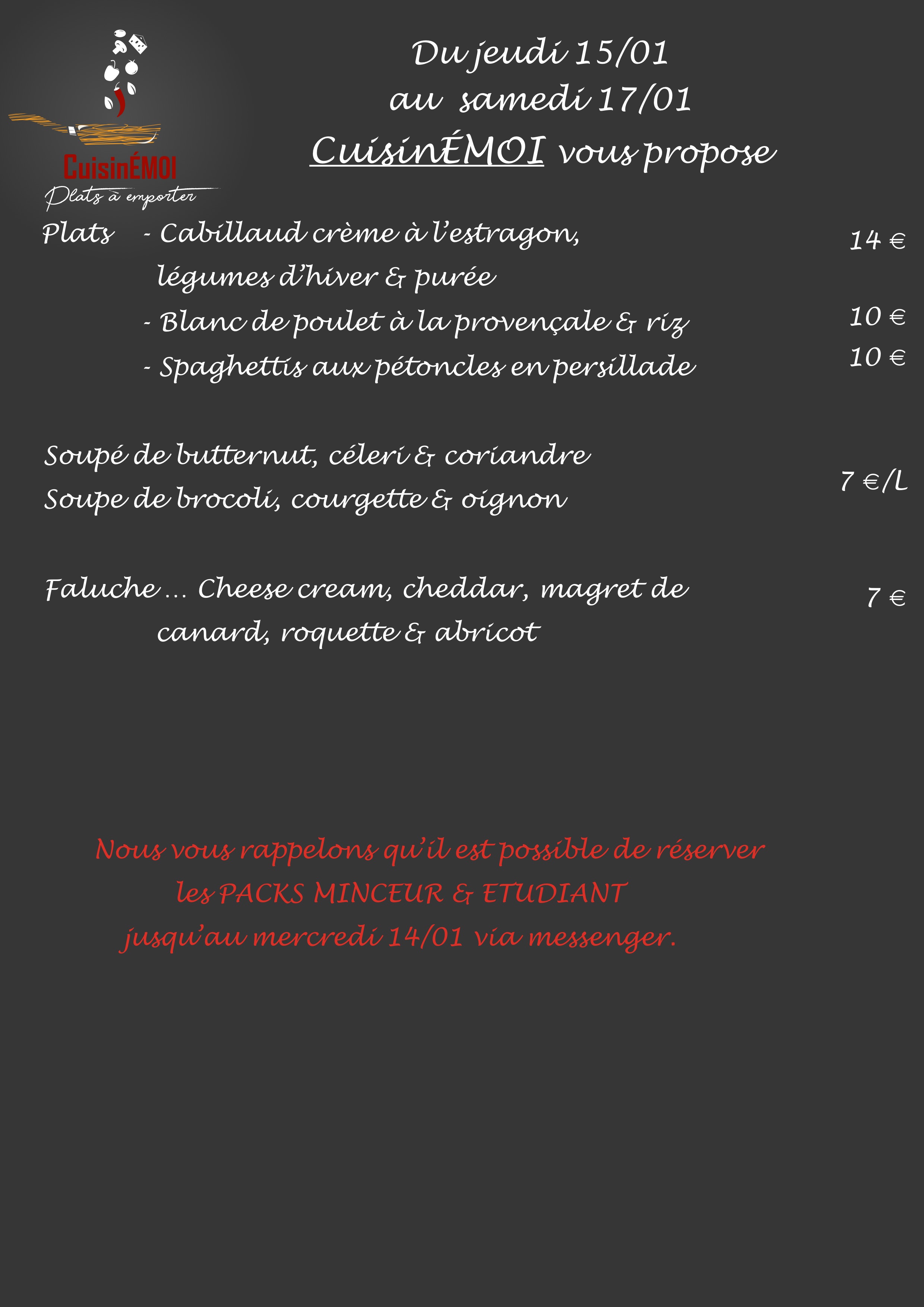 CuisinÉMOI y pense aussi ! Suivez les informations ponctuelles ou choisissez les formules disponibles toute l'année (voir formule traiteur).